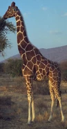 The reticulated giraffe (Giraffa reticulata) is a species of giraffe native to the Horn of Africa. It is differentiated from the other giraffe species by its coat, which consists of large, polygonal (or squared), block-like spots, which extend onto the lower legs, tail and face. These prominent liver-red spots also show much less white between them, when compared to other giraffe species. With up to 6 meters in height, the reticulated giraffe is the largest species of giraffe and the tallest land animal in general. While the reticulated giraffe may yet still be found in parts of its historic range, such as areas of Somalia and Ethiopia, its population stronghold is primarily within Kenya. There are approximately 8,500 individuals living in the wild. In both captivity and the wild, as of 2024 there are 15,785 individuals across the world.[citation needed]